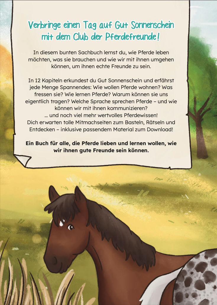 Das Buch steckt voller wertvollem Pferdewissen, Mitmachseiten und Bastelideen. So lernen Kinder spielerisch, was echte Freundschaft zwischen Mensch und Pferd bedeutet. Perfekt für kleine Pferdefreund:innen – und alle, die mehr über ihre Lieblinge erfahren möchten.