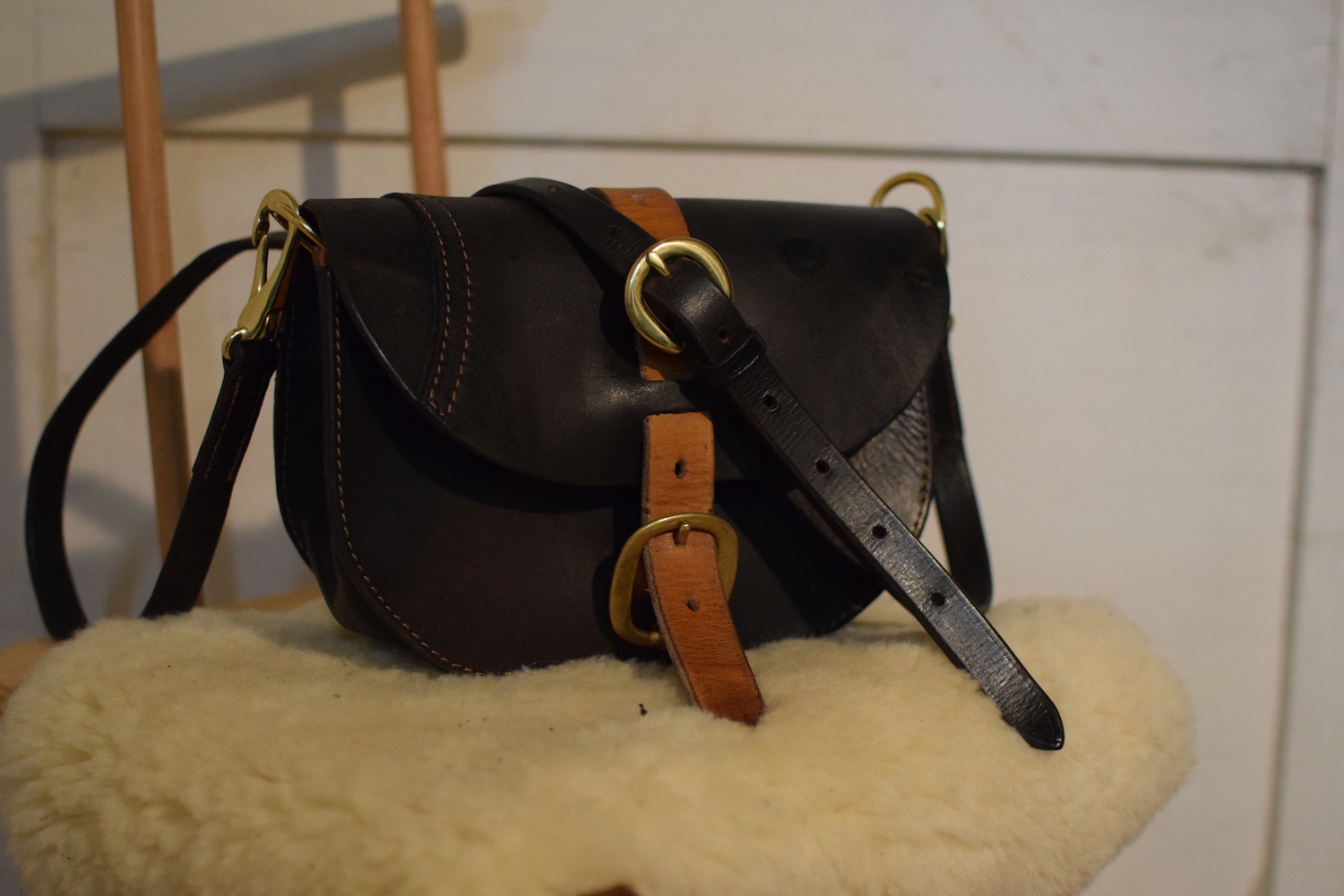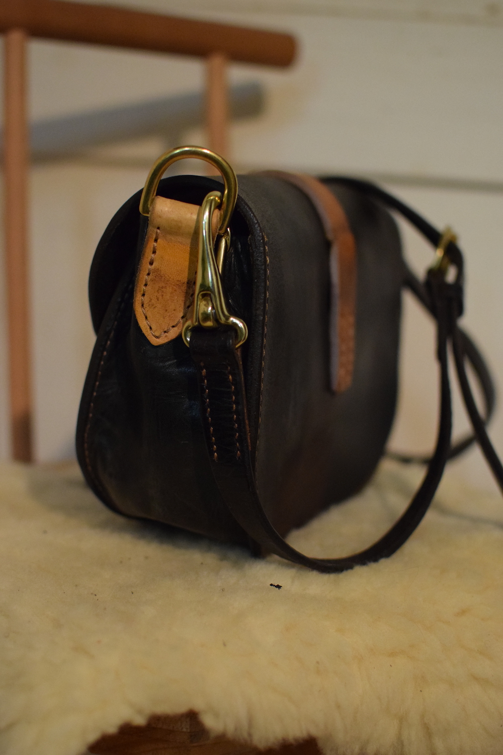 Korpus: schwarzes Sattelleder | Kontrast-Details: cognacfarbenes Leder aus recycelten Sattelteilen | Beschläge: Messing | Träger: verstellbarer Crossbody-Riemen aus schwarzem Leder | Hergestellt am Starnberger See, von Hannah persönlich gefertigt